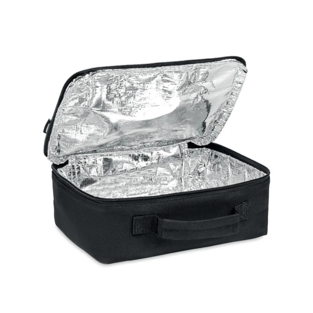 Izolirana torba za ručak/ hladnjak u 600D RPET s ručkom za nošenje. Podstava od aluminijske folije 2 mm.