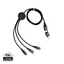 Kabel za punjenje izrađen od recikliranog aluminija s certifikatom RCS (Recycled Claim Standard), recikliranog TPE-a i recikliranog PET-a. Ukupni reciklirani sadržaj: 65% na temelju ukupne težine predmeta. RCS certifikat osigurava potpuno certificirani opskrbni lanac recikliranih materijala. Aluminij ne gubi svoje karakteristike u procesu recikliranja i može se neograničeno reciklirati. S dvostrukim ulaznim konektorom: USB A i tip-C. Trostruki izlaz: Apple Lightning/Micro i Type C, nudeći ukupno 6 opcija punjenja. S RCS certificiranim pletenim, recikliranim PET kabelom duljine 120 cm. Pakirano u FSC® mix ambalažu. Prikladno za punjenje, sinkronizaciju i kompatibilno s CarPlayom. Podržava brzo punjenje do 9V/2A.