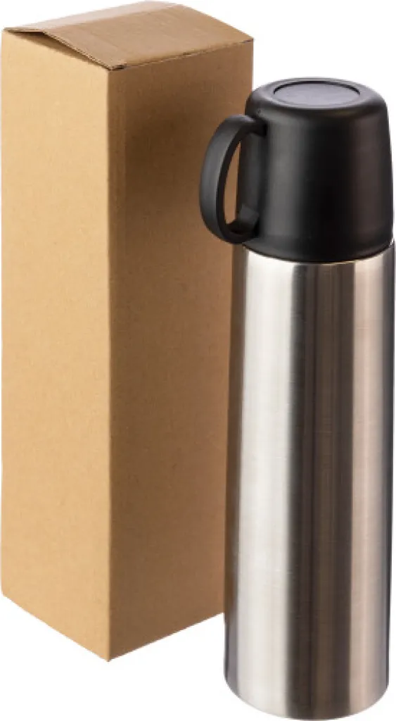 Dvoslojna vakuumska boca od nehrđajućeg čelika (s/s304) (500 ml) s PP šalicom/poklopcem. Kapacitet čaše je 130 ml. Pakirano po komadu u smeđu kartonsku kutiju.