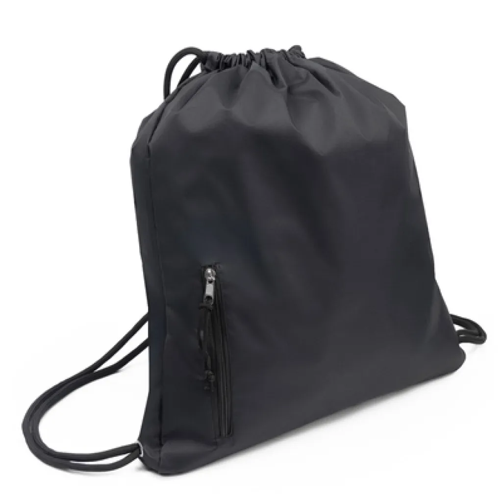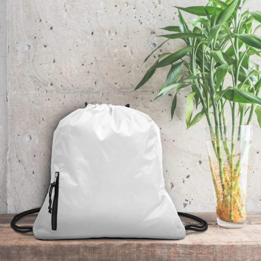 Prostrana torba s uzicom, debela uzica omogućuje nošenje na leđima, izrađena od ojačanog vodootpornog materijala koji pruža veću zaštitu od vremenskih uvjeta, u nju mogu stati namirnice ili odjeća za vježbanje u teretani, modernog dizajna, ima funkcionalan prednji džep za sitnice s vodootpornim patentnim zatvaračem, proizvod od poliestera 230 g/m2