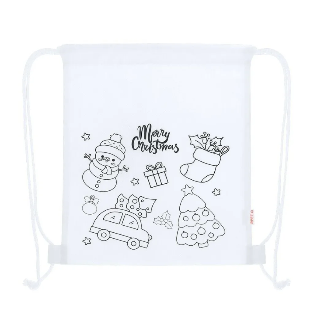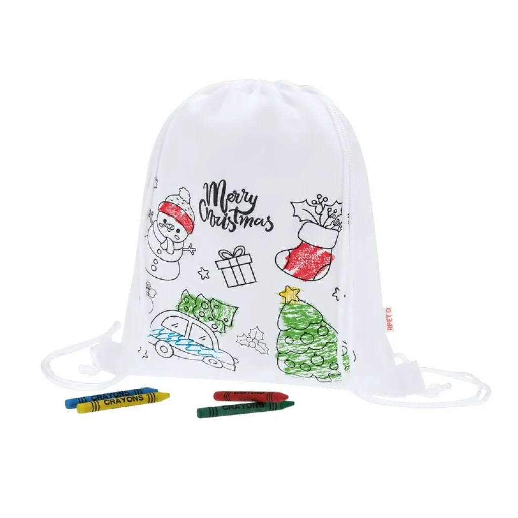 Torba s vezicama za bojanje. Vezice omogućuju nošenje na poleđini. Sadrži crtež s božićnom temom na prednjoj strani te RPET ikonu na etiketi. Uključene četiri pastele. Proizvod izrađen od netkanog RPET-a.