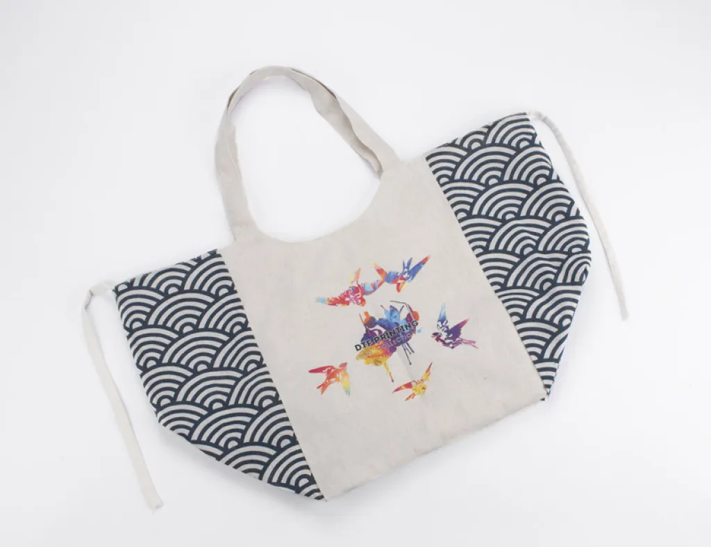 Boho torba za kupovinu izrađena od pamuka i poliestera, s unutarnjim džepom i vezicama za jednostavno zatvaranje.