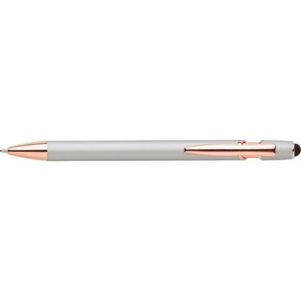 Aluminijska kemijska olovka s dijelovima u boji ružičastog zlata i gumenim vrhom za ekrane osjetljive na dodir, plava tinta. Kada se ugravira, dizajn će biti srebrne boje.