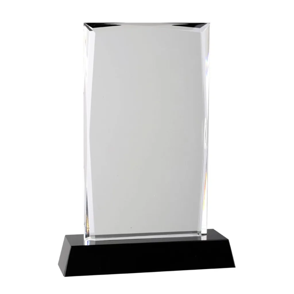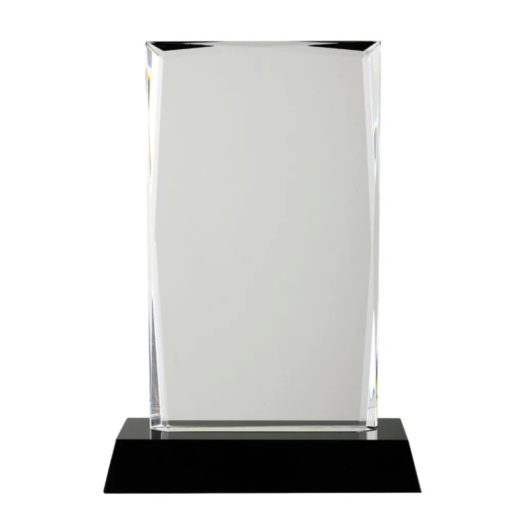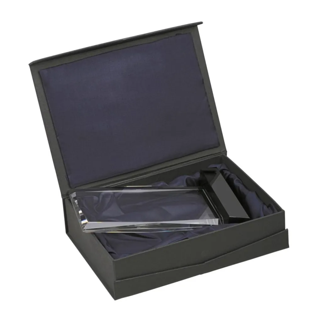 Kristalni trofej zamotan u elegantnu crnu kutiju s bijelim kartonskim poklopcem.