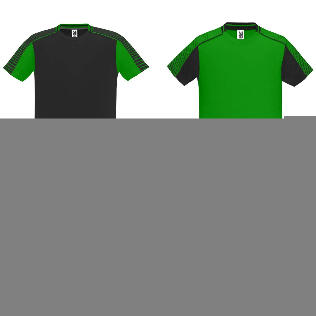 Komplet se sastoji od dvije majice i jednog para kratkih hlača. Boja druge majice dizajnirana je obrnuto u odnosu na prvu. Tehnička i prozračna tkanina. Majice s tiskanim polu-raglan rukavima. Okrugli izrez s trikot tkaninom na stražnjoj strani. Kratke hlače s elastičnim pojasom i unutarnjom vezicom u istoj boji, s dodatnim sigurnosnim šavom. Hlače s kontrastnom bočnom trakom i prorezima na rubu. Uklonjiva etiketa.
