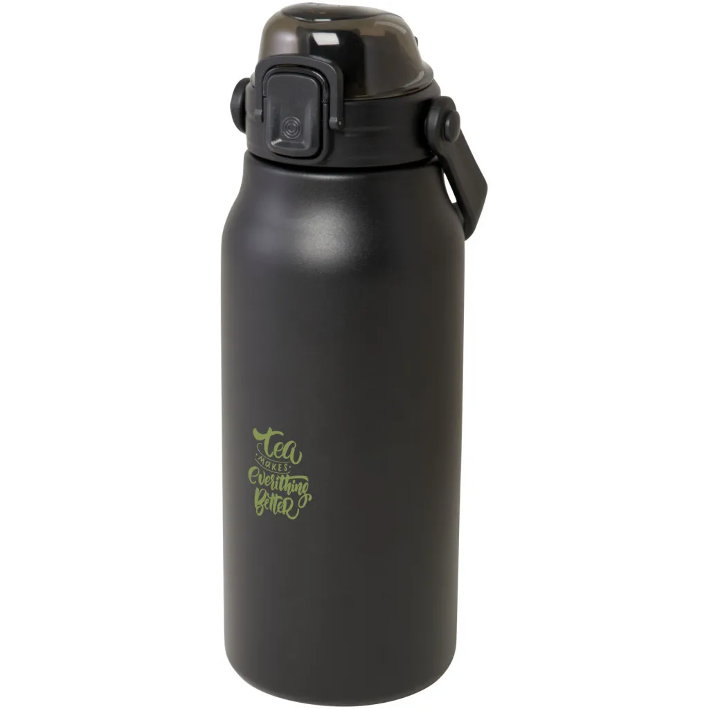 Ova velika boca od recikliranog nehrđajućeg čelika s RCS certifikatom držat će vas hidratiziranim tijekom dana sa stilom. Bakrena vakuumska izolacija držat će pića vrućima ili hladnima nekoliko sati, a sa svojom sklopivom ručkom lako ga je nositi. Boca je nepropusna i ima mehanizam za jednostavno otvaranje gumbom. Zapremina je 1600 ml. Predstavljeno u poklon kutiji od recikliranog kartona.