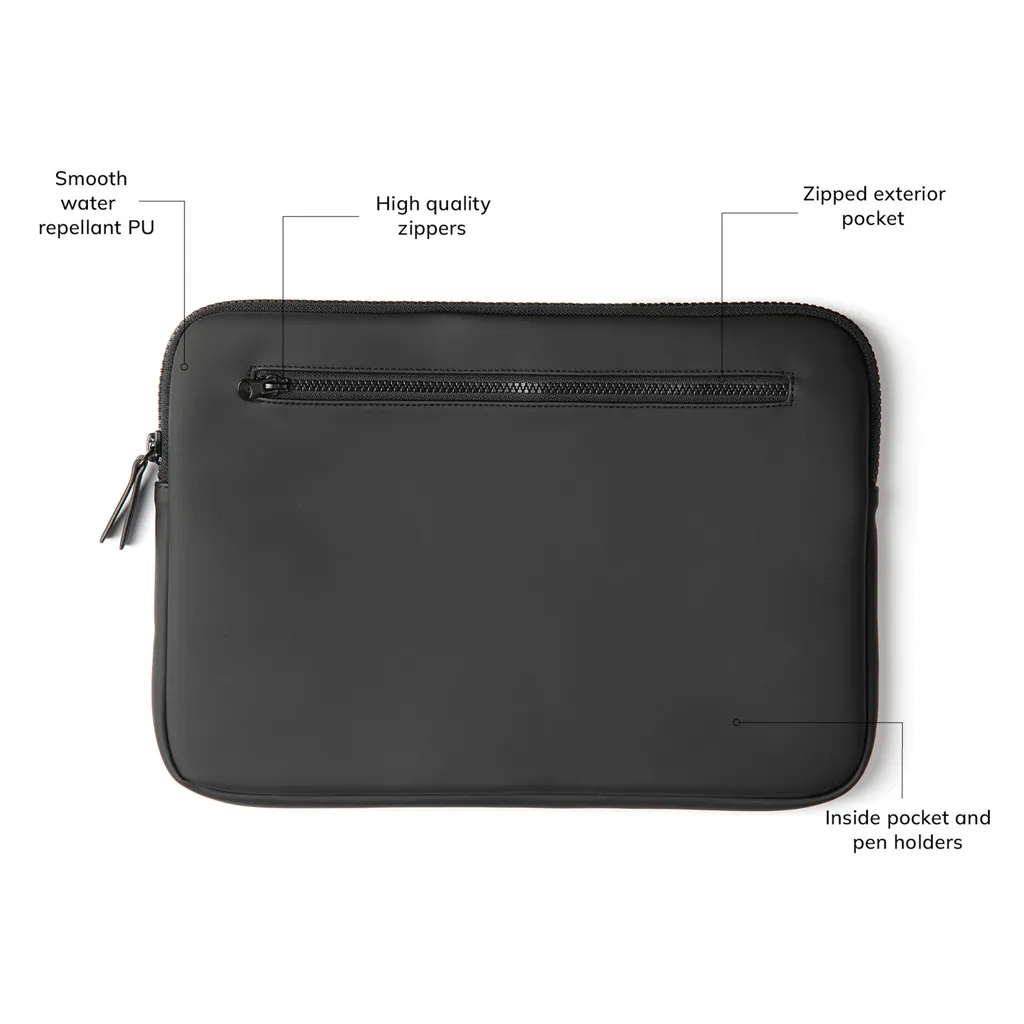 Elegantna futrola za laptop za zaštitu od udaraca i vlage. Izrađena od lagane, vodootporne nubuck PU tkanine s elegantnom mat vanjskom površinom i laganom sintetičkom unutarnjom tkaninom. Odgovara prijenosnim računalima do 17".