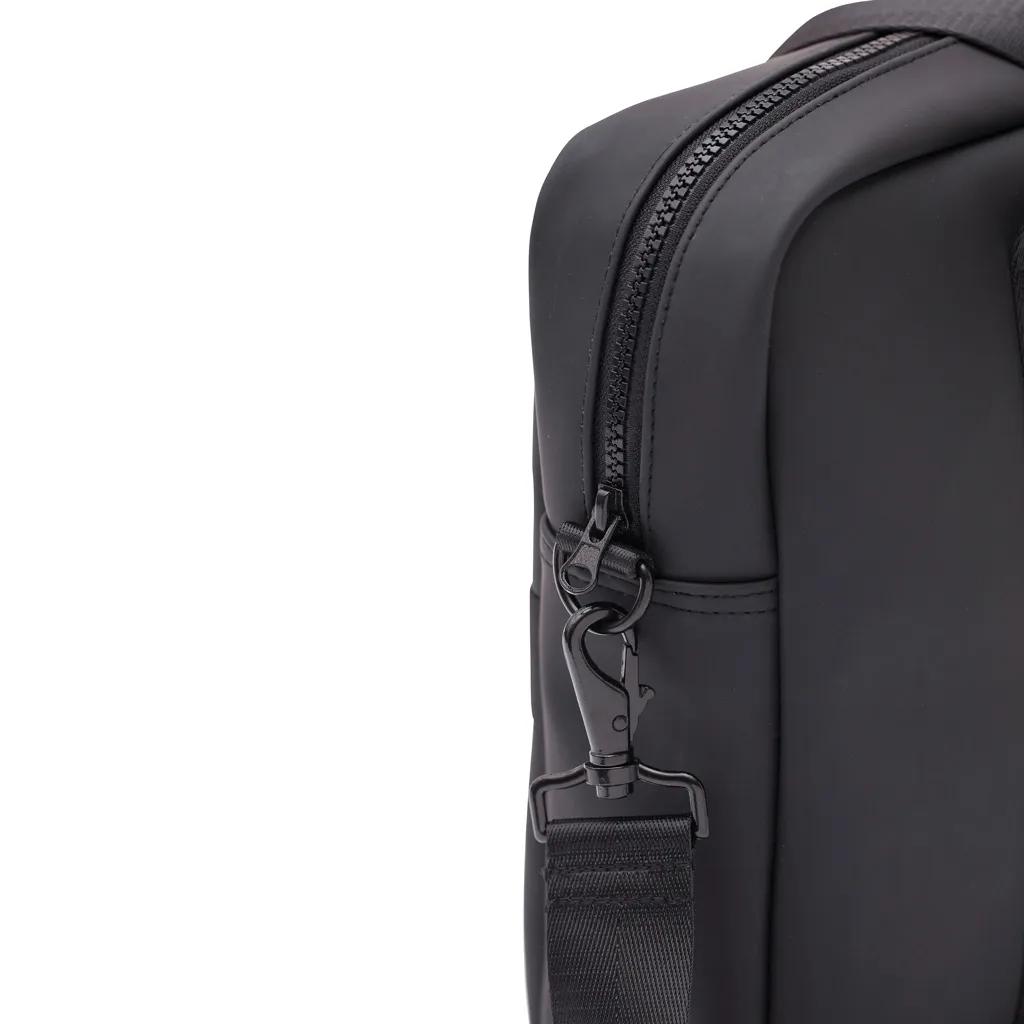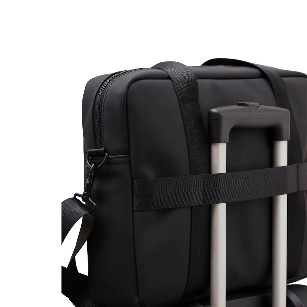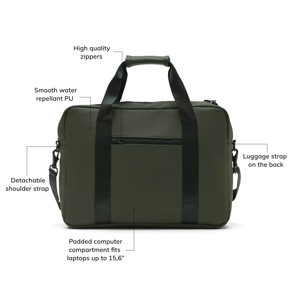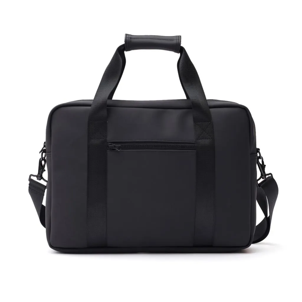 Torba za laptop modernog dizajna i čistih linija. Funkcije i oblik dolaze zajedno, osim običnog pretinca za laptop, ova torba također ima mjesta za olovke, dokumente i druge stvari. Torba je izrađena od vodootpornog materijala, s naramenicom i ručkama za nošenje. Također uključuje pričvršćenu traku na stražnjoj strani, tako da odgovara vašem koferu kada putujete.