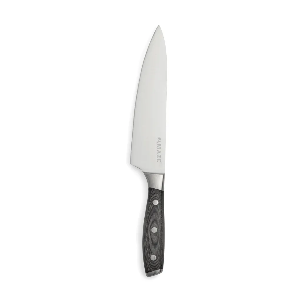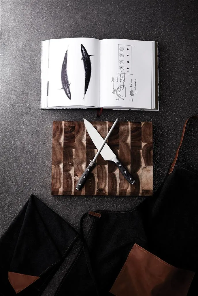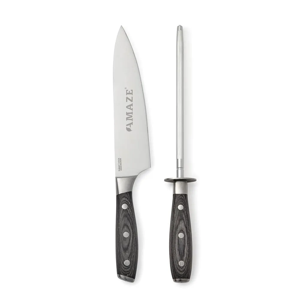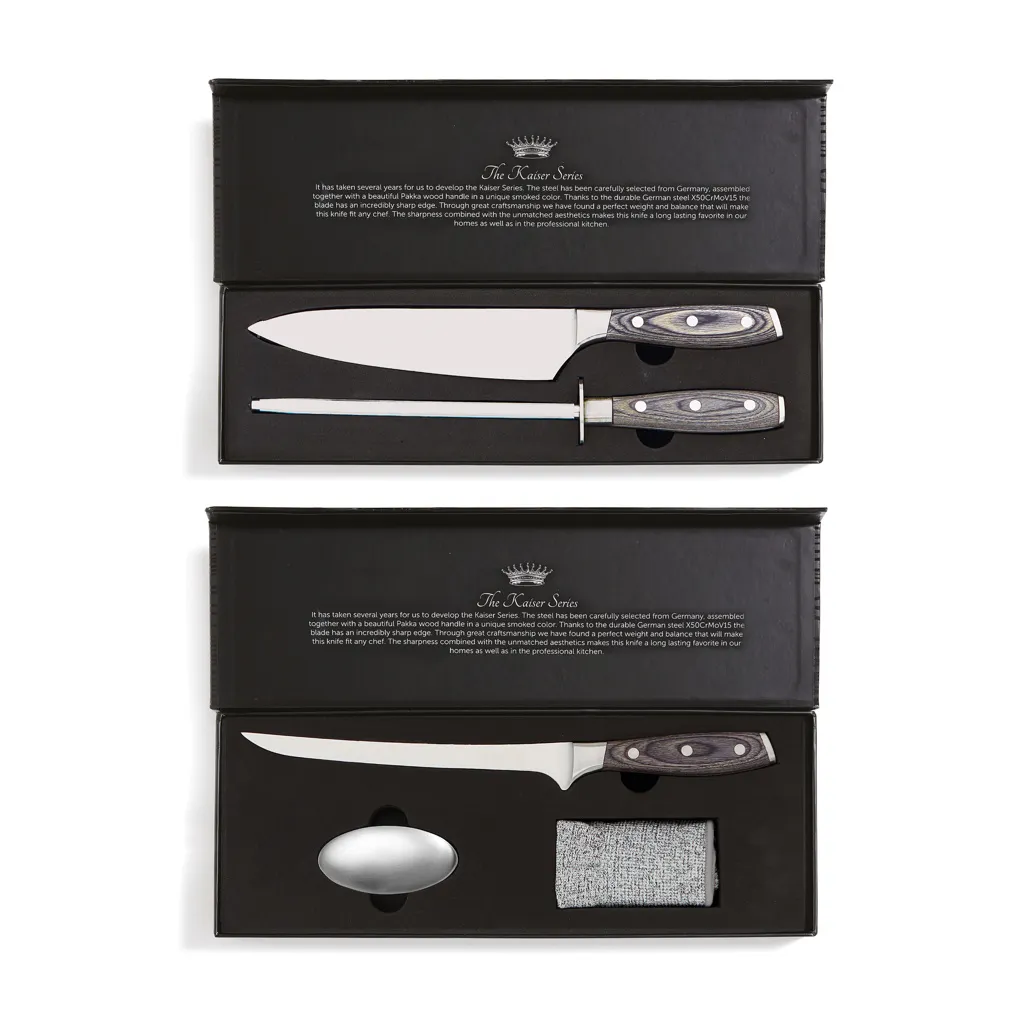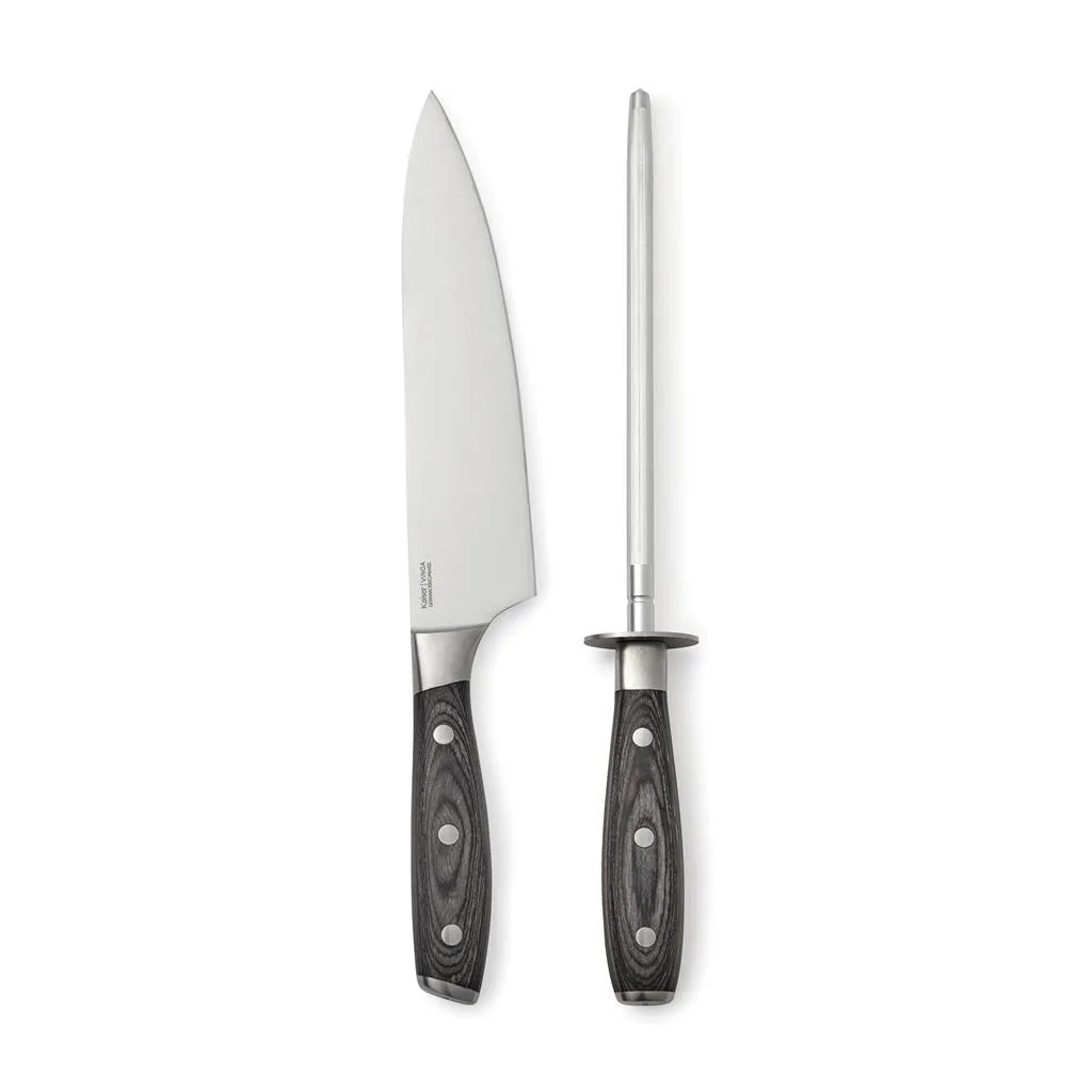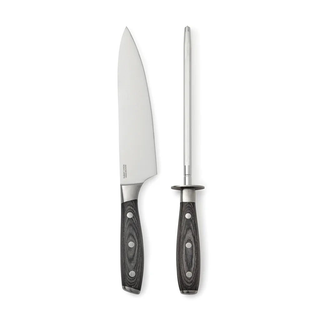 Kuharski nož i čelik za brušenje iz asortimana Kaiser. Nož je izrađen od njemačkog čelika X50CrMoV15, a drška od Pakkawooda. Ručka koja se lako drži i vrhunska ravnoteža u oštrici čine nož udobnim i lakim za rad. Inherentna svojstva njemačkog čelika čine oštricu otpornom na mrlje i ne zahtijevaju više brige od povremenog oštrenja. Kuharski nož: oštrica od 20 cm. Čelik za oštrenje: 33 cm.