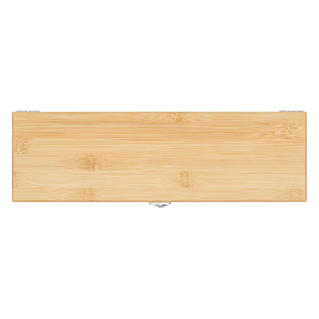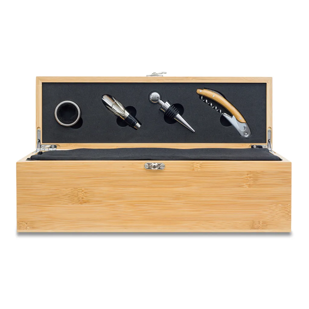 Kutija za vino od bambusa obložena tkaninom. U setu se nalazi otvarač za vino vadičep, prsten protiv kapanja, čep, točilica sa zatvaračem.
