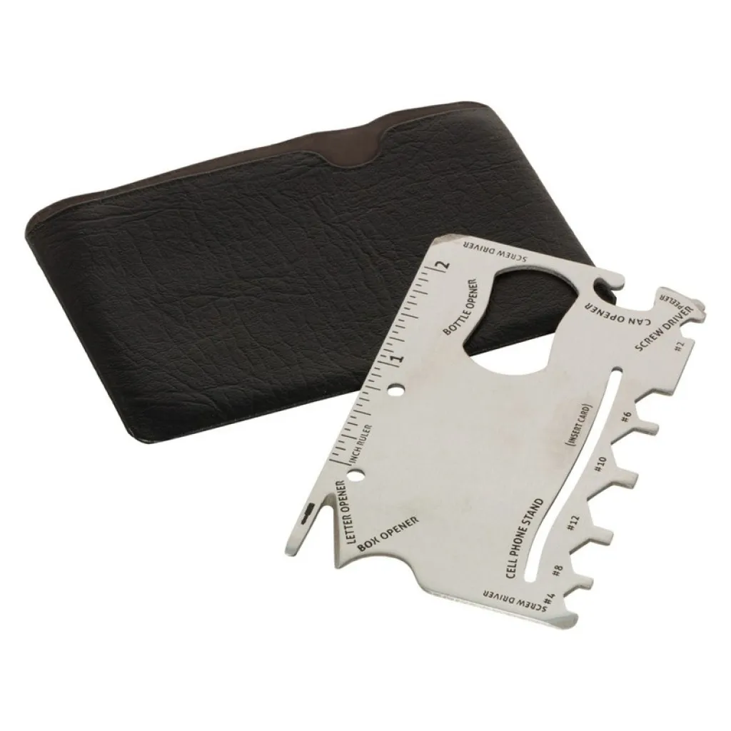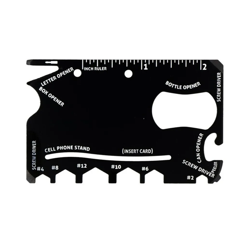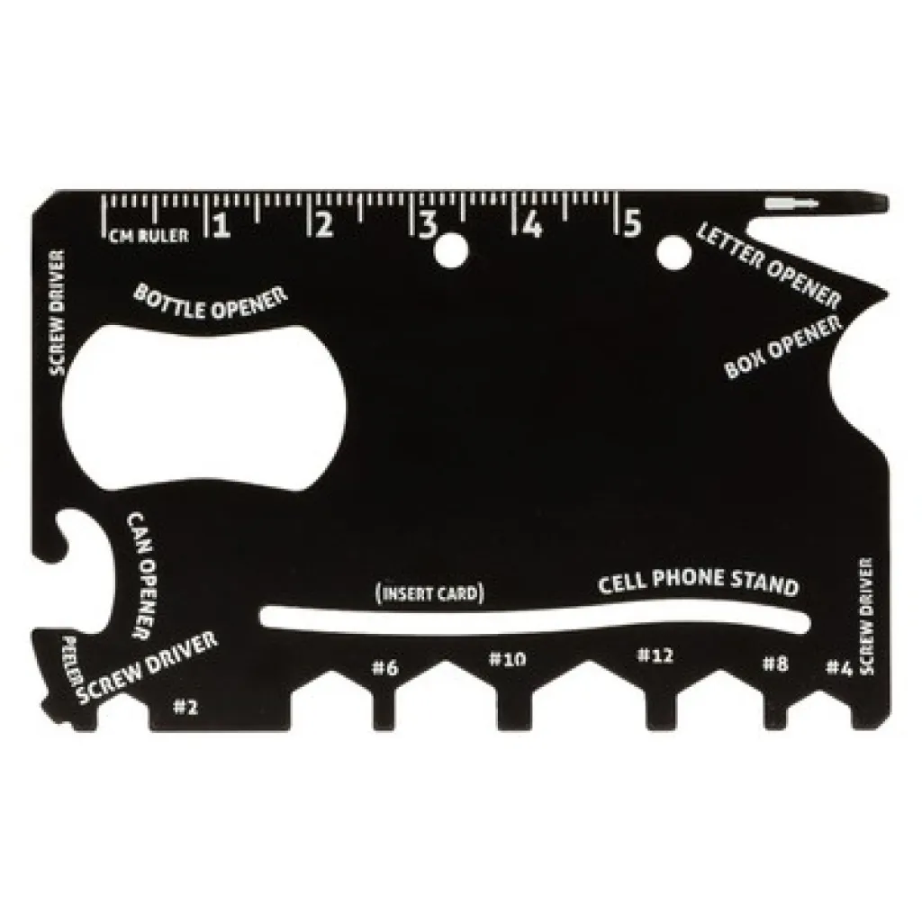 Višenamjenski alat u futroli, 9 funkcija: ravnalo, mini odvijač, otvarač kutija, 2x odvijač, imbus ključ (#2, #4, #6, #8, #10, #12), stalak za mobitel (kartica nije uključena), otvarač za konzerve, otvarač za boce.