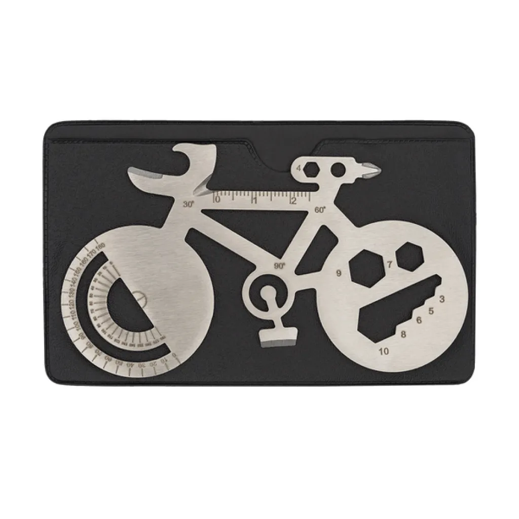 Višenamjenski alat od nehrđajućeg čelika u obliku bicikla, u kućištu. Sadrži: 1. kutomjer, 2. nož, 3. otvarač za boce, 4. ravnalo (mjerenje u cm), 5. šesterokutni ključ, 6. Phillips odvijač, 7. šesterokutni ključevi, 8. ravni odvijač.