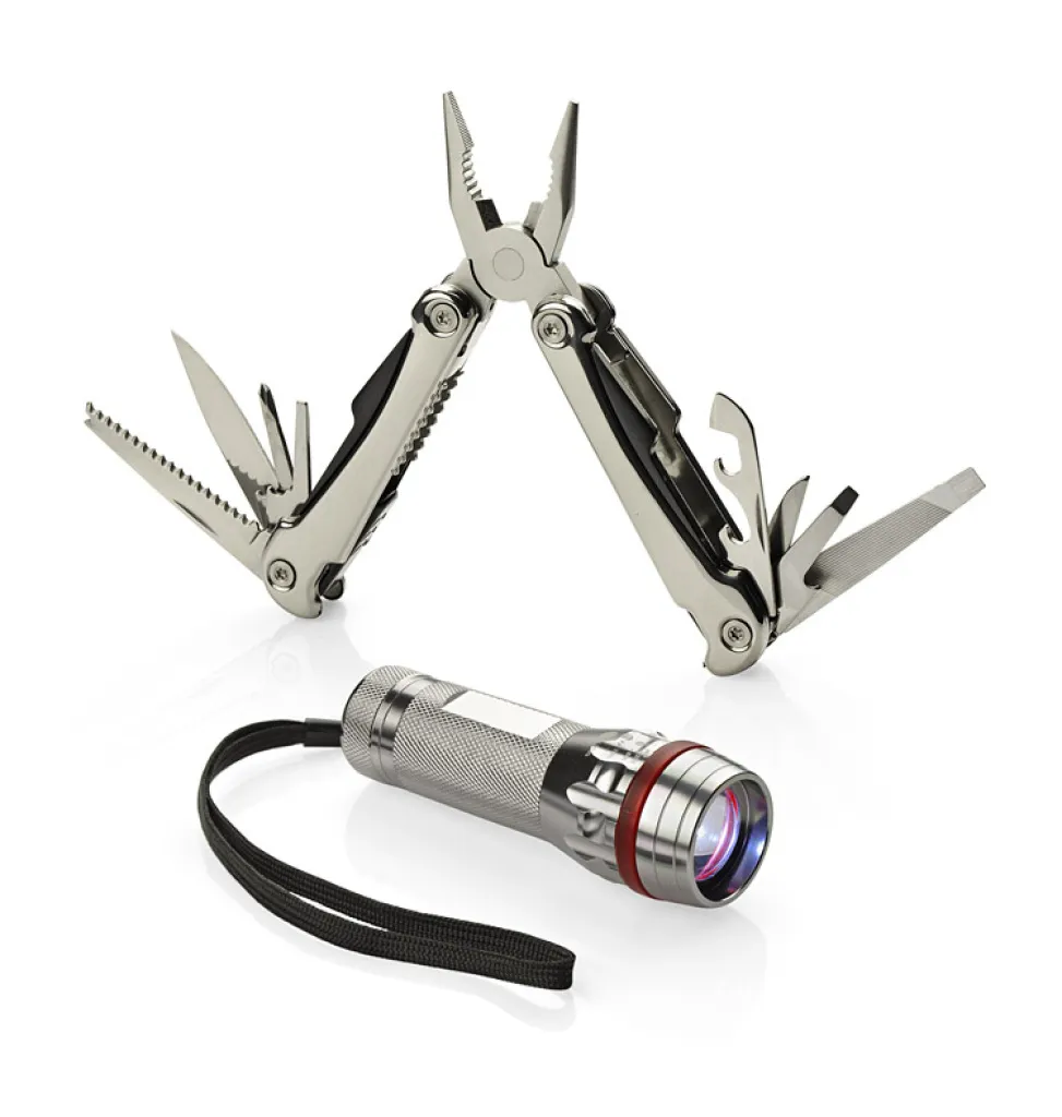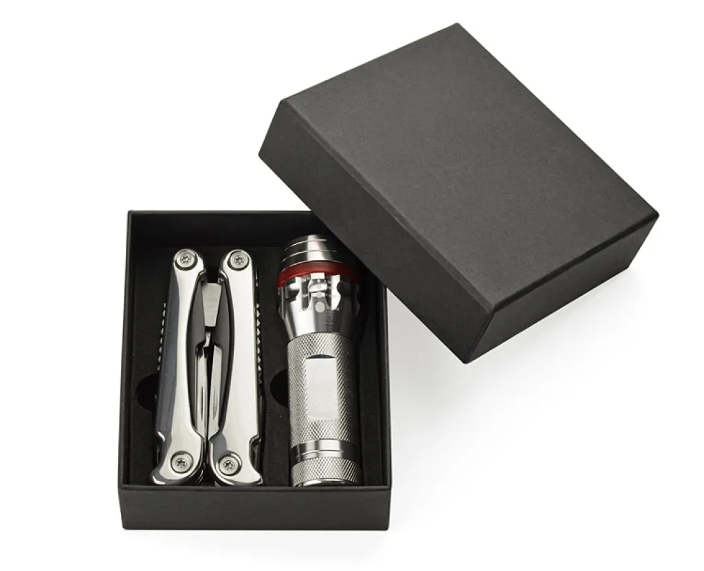 Poklon set sadrži baterijsku lampu i multifunkcionalni alat. LED svjetiljka ima vrlo jaku diodu, podesivi snop i 3 načina rada sa zoom funkcijom. Svi elemeniti seta su izrađeni od metala i pogodni su za graviranje. Set dolazi pakiran u elegantnu crnu poklon kutiju.