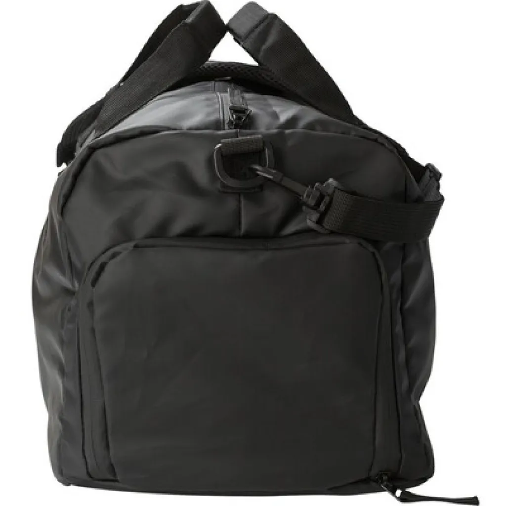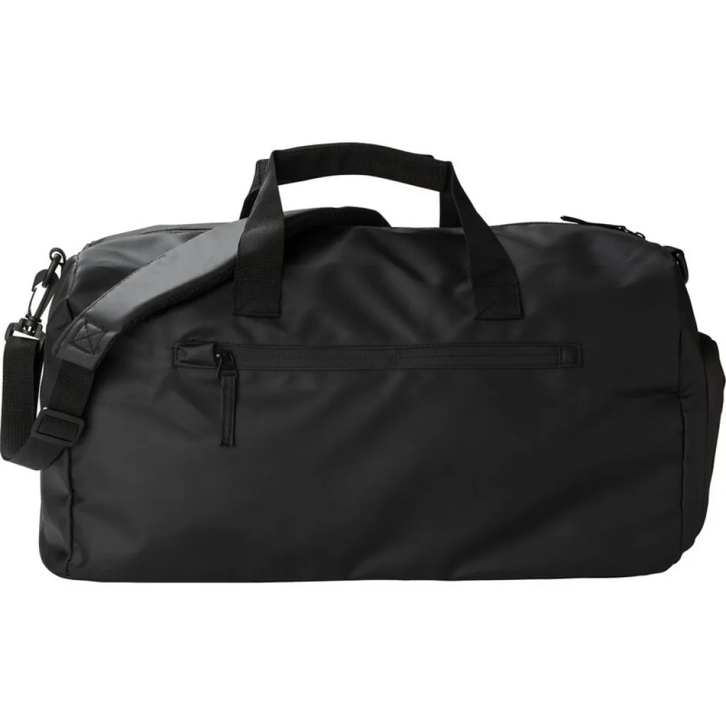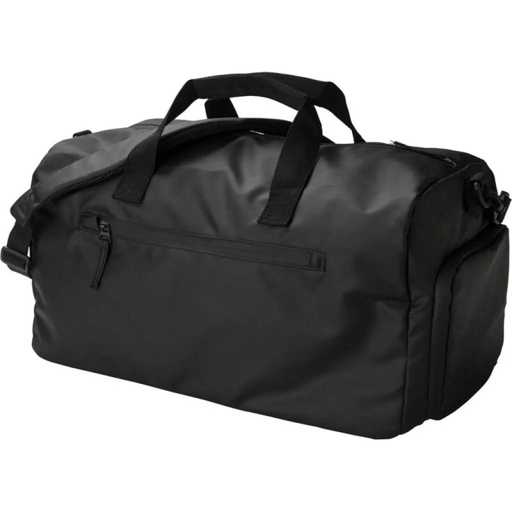 Vodootporna putna torba izrađena od poliestera s ojačanim dnom, džepovima s patentnim zatvaračima, džepom za cipele, naramenicom i ručkama.