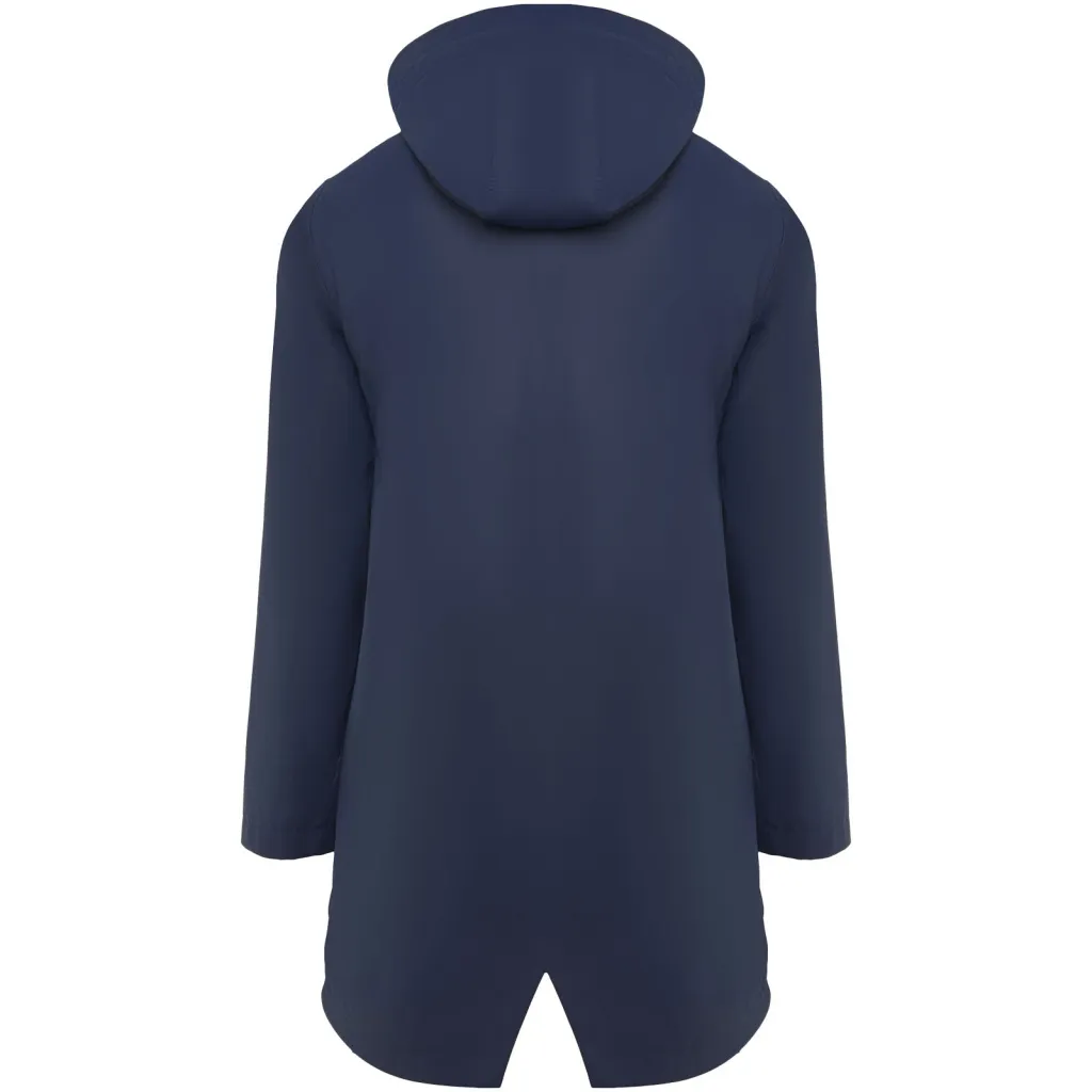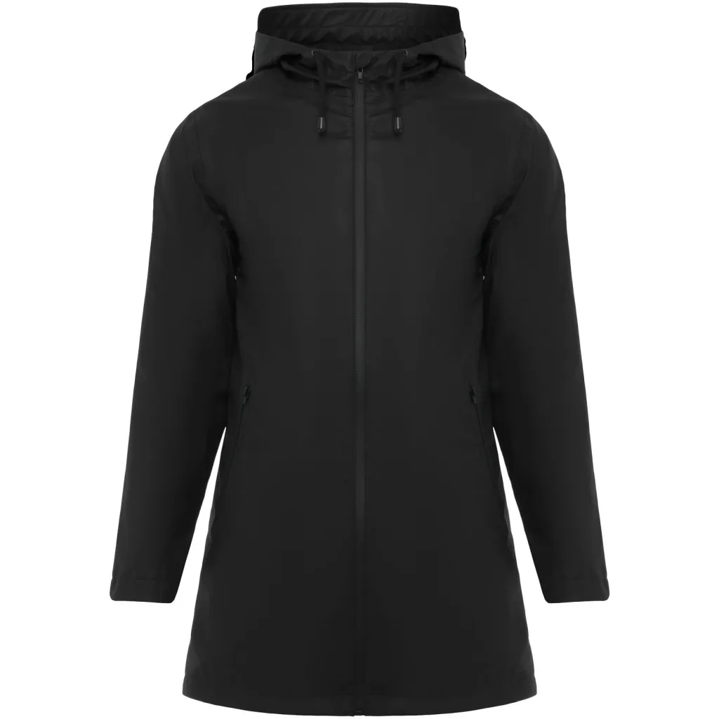 Vodootporni kišni kaput za žene. Kapuljača s vizirkom. Patentni zatvarači i šavovi zapečaćeni toplinom. Kontrastni detalji u crnoj boji. Dva bočna džepa s patentnim zatvaračima. Prorez na stražnjem rubu. Odvojiva etiketa. Vodootporno. Model je visok 179 cm i nosi veličinu S.